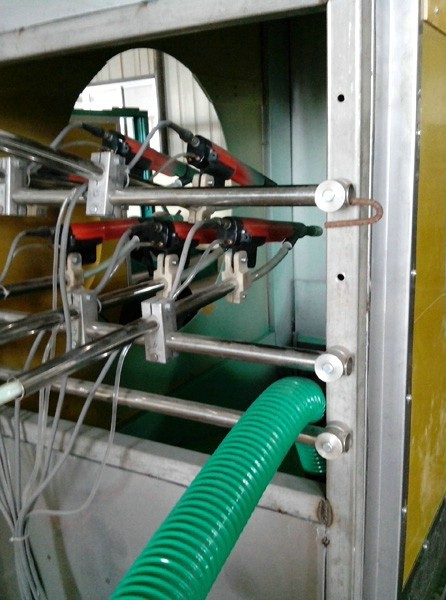 靜電外噴粉是以具有霧化咀(使涂料霧化)和放電級(發生電量電流)的涂裝機使涂料微粒化,對之施加電荷,在電極與被涂物體之間形成電場,利用其靜電吸附作用而涂裝。